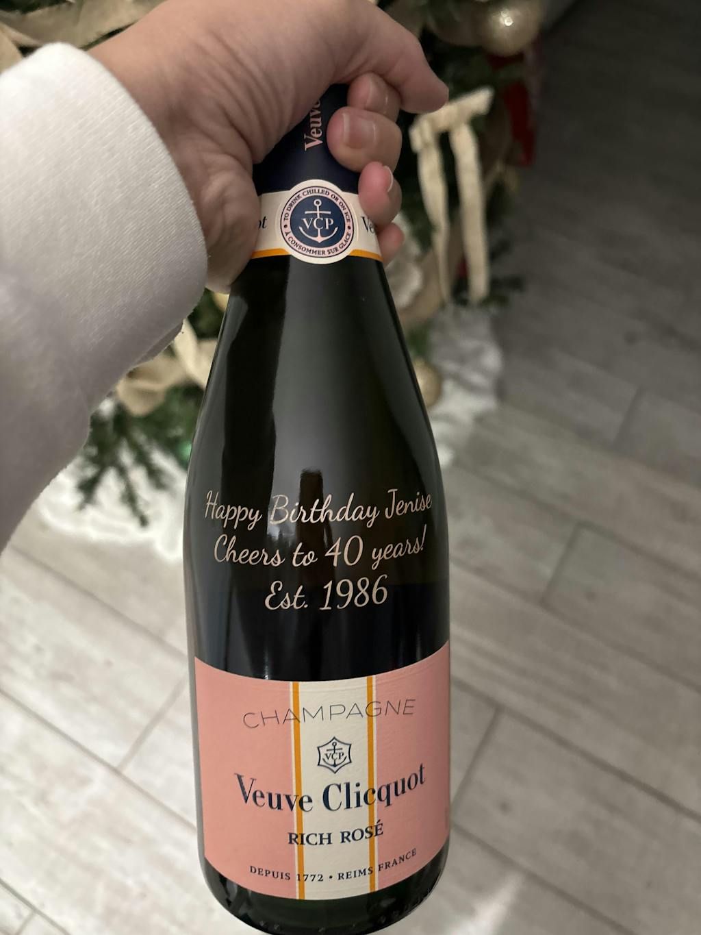 Agregue un grabado personalizado a su Champán Veuve Clicquot Rich Rose : perfecto para cumpleaños, aniversarios, días festivos, regalos para clientes y cualquier ocasión especial.