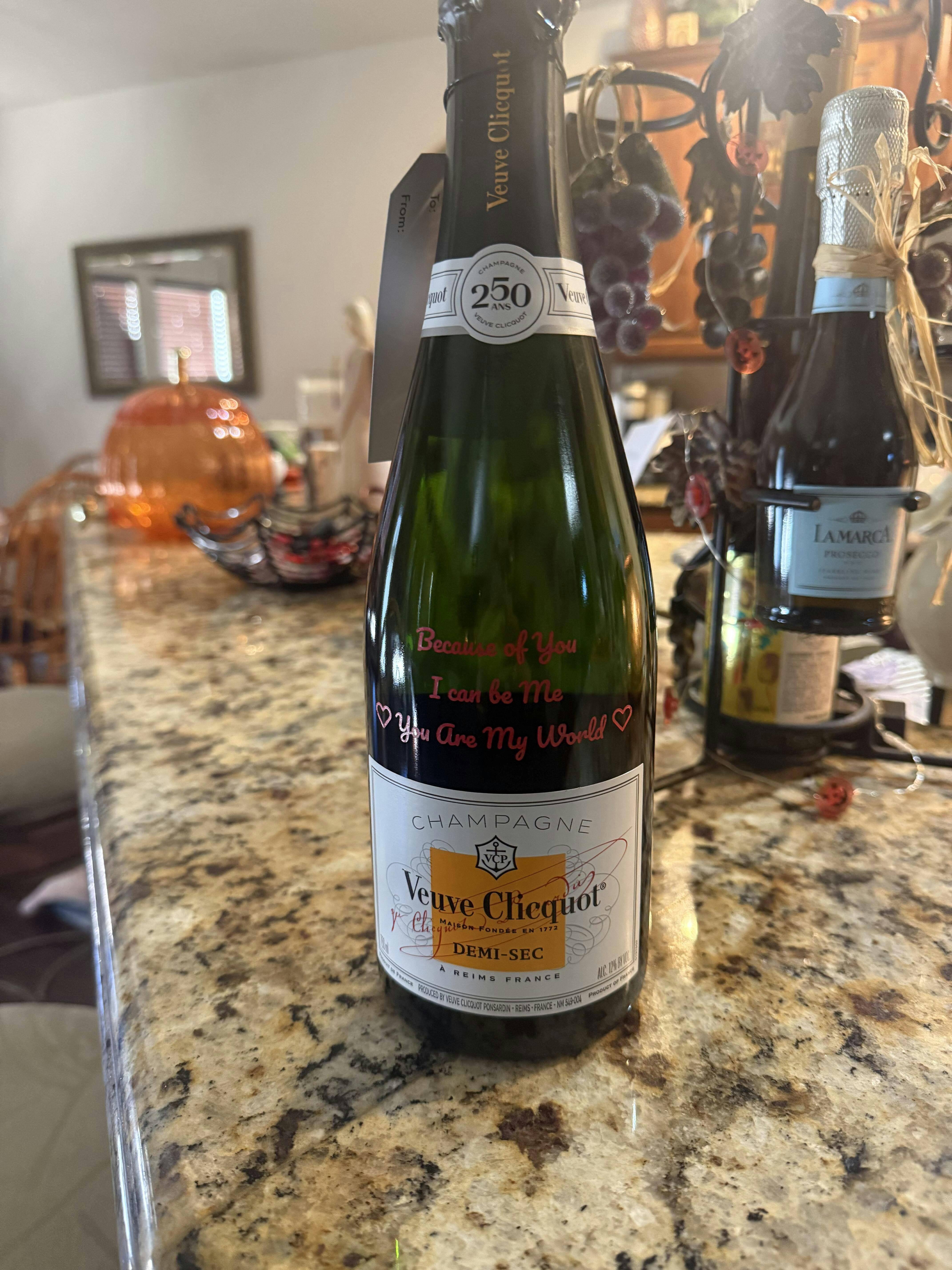 Add a custom engraving to your Veuve Clicquot Demi Sec Champagne— Perfect for birthdays, anniversaries, holidays, client gifts and any special occasion.